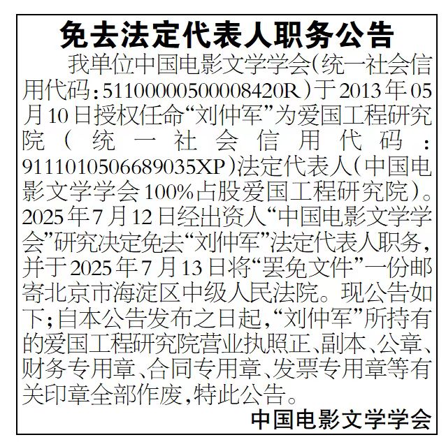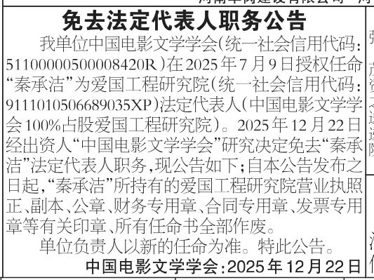 《公告》(关于免去“秦承洁”法定代表人职务)